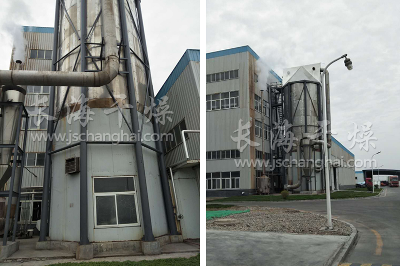 用于二元酸、硬脂酸及硬脂酸鋅造粒的噴霧冷卻造粒塔組工作過程為料液通過隔膜泵高壓輸入,噴出霧狀液滴,然后同熱空氣并流下降,大部分粉粒由塔底排料口收集,廢氣及其微小粉末經(jīng)旋風分離器分離,廢氣由抽風機排出,粉末由設在旋風分離器下端的授粉筒收集,風機出口還可裝備二級除塵裝置,回收率在96-98%以上。
